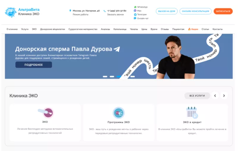 Μια διαφήμιση στην ιστοσελίδα της κλινικής AltraVita, εξακολουθεί να διαφημίζει το σπέρμα του Ντούροφ.