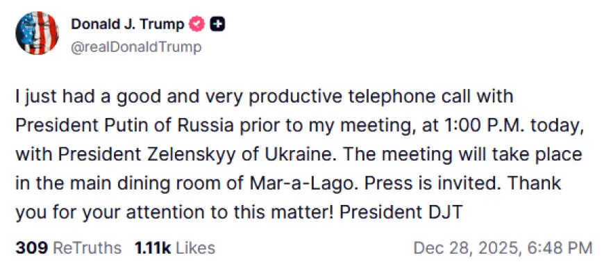 Η ανάρτηση του προέδρου αναφέρει: «Μόλις είχα μια καλή και πολύ παραγωγική τηλεφωνική συνομιλία με τον πρόεδρο Πούτιν πριν από τη συνάντησή μου, σήμερα στις 13:00 [20:00 ώρα Κύπρου], με τον πρόεδρο Ζελένσκι της Ουκρανίας. Η συνάντηση θα πραγματοποιηθεί στην κεντρική τραπεζαρία του Μαρ-α-Λάγκο. Ο Τύπος είναι προσκεκλημένος. Σας ευχαριστώ για την προσοχή σας σε αυτό το θέμα! Πρόεδρος Τραμπ».