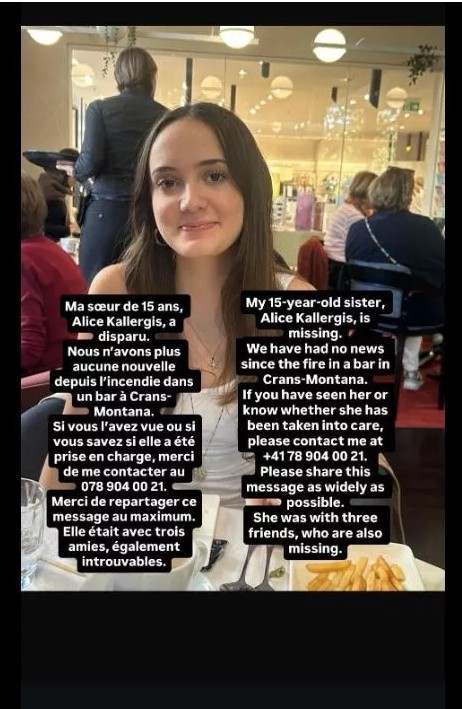 «Δεν ξέρουμε τίποτα για την αδερφή μου, ακόμα» δήλωσε στο protothema.gr ο Ρομέν Καλλέργης, αδελφός της 15χρονης Αλίκης που αγνοείται μετά την καταστροφική πυρκαγιά που εκδηλώθηκε στο μπαρ «Le Constellation», στο Κραν Μοντανά της Ελβετίας.
