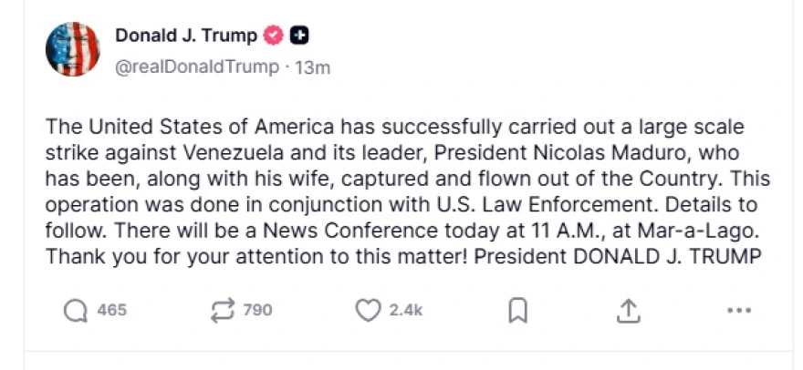 «Οι Ηνωμένες Πολιτείες της Αμερικής πραγματοποίησαν με επιτυχία μια μεγάλης κλίμακας επίθεση εναντίον της Βενεζουέλας και του ηγέτη της, Προέδρου Νικολάς Μαδούρο, ο οποίος, μαζί με τη σύζυγό του, συνελήφθη και μεταφέρθηκε αεροπορικώς εκτός της χώρας. Η επιχείρηση αυτή πραγματοποιήθηκε σε συνεργασία με τις αμερικανικές αρχές επιβολής του νόμου. Λεπτομέρειες θα ακολουθήσουν. Σήμερα στις 11 π.μ. θα πραγματοποιηθεί συνέντευξη Τύπου στο Mar-a-Lago. Σας ευχαριστούμε για την προσοχή σας σε αυτό το θέμα!»