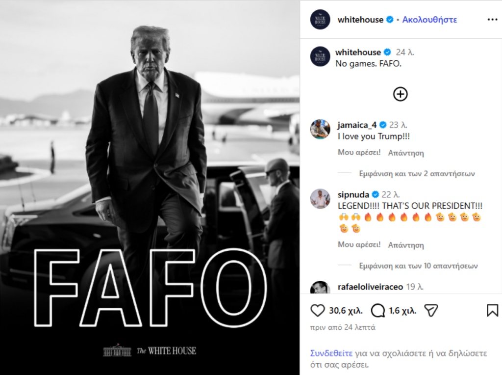Οπότε, υπ’ αυτή την έννοια, το FAFO μπορεί μεν να μην δικαιολογεί οποιαδήποτε απόπειρα κατάληψης/προσάρτησης, στην πράξη όμως αυτό πολύ μικρή σημασία έχει. Όταν η Δανή πρωθυπουργός βλέπει κάποιον σαν τον Νικολάς Μαδούρο, ο οποίος έως πριν από μερικές ημέρες κόμπαζε ότι δεν φοβάται κανέναν, κραυγάζοντας το δικό του «μολών λαβέ» και τώρα σύρεται σιδηροδέσμιος μεταξύ φυλακής και δικαστηρίου, έχει κάθε λόγο να πιστεύει ότι η Γροιλανδία θα είναι ο επόμενος στόχος του, ασταμάτητου, Ντόναλντ Τραμπ.