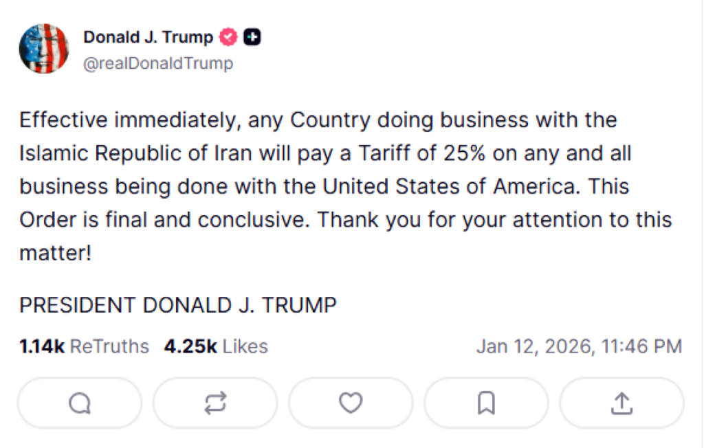 «Από τώρα και στο εξής, οποιαδήποτε χώρα κάνει επιχειρηματικές συναλλαγές με την Ισλαμική Δημοκρατία του Ιράν θα πληρώνει δασμό 25% σε κάθε και οποιαδήποτε συναλλαγή με τις Ηνωμένες Πολιτείες της Αμερικής. Αυτή η απόφαση είναι τελική και αμετάκλητη. Ευχαριστώ για την προσοχή σας σε αυτό το ζήτημα», έγραψε χαρακτηριστικά ο Ντόναλντ Τραμπ.