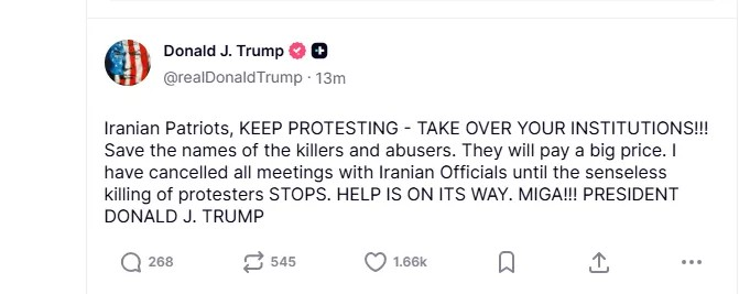 «Ιρανοί Πατριώτες, ΣΥΝΕΧΙΣΤΕ ΝΑ ΔΙΑΜΑΡΤΥΡΕΥΕΣΤΕ – ΠΑΡΤΕ ΤΟΝ ΕΛΕΓΧΟ ΤΩΝ ΘΕΣΜΩΝ ΣΑΣ!!! Κρατήστε τα ονόματα των δολοφόνων και των κακοποιητών. Θα πληρώσουν ένα μεγάλο τίμημα. Έχω ακυρώσει όλες τις συναντήσεις με Ιρανούς αξιωματούχους μέχρι να ΣΤΑΜΑΤΗΣΕΙ η παράλογη δολοφονία διαδηλωτών. Η ΒΟΗΘΕΙΑ ΕΙΝΑΙ ΚΑΘ’ ΟΔΟΝ. MIGA!!!»