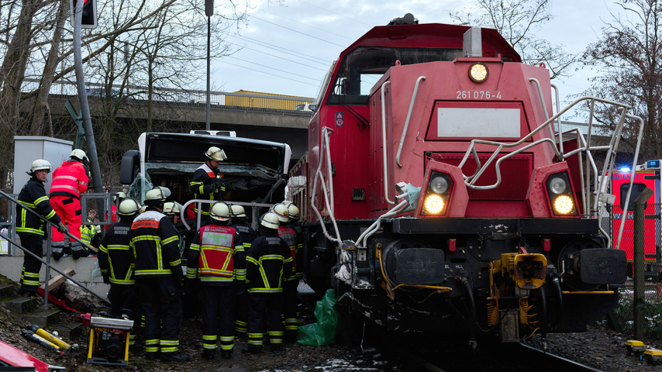 Schwerer Unfall im Hamburger Hafen. Zug kollidiert an der Nippoldstraße mit Linienbus. 1 Toter – mehrere Verletzte – Großeinsatz der Feuerwehr.