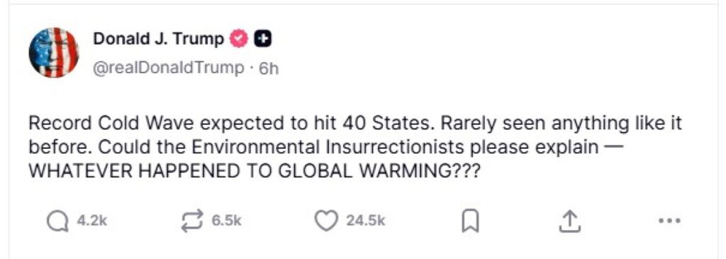 «Ένα κύμα ψύχους ρεκόρ αναμένεται να πλήξει 40 πολιτείες. Σπάνια έχουμε ξαναδεί κάτι τέτοιο. Άραγε οι επαναστάτες του περιβάλλοντος θα μπορούσαν να μου εξηγήσουν: Τι συνέβη με την κλιματική αλλαγή;», έγραψε ο Αμερικανός πρόεδρος.