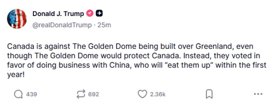 Ο Ντόναλντ Τραμπ γράφει: «Ο Καναδάς είναι αντίθετος στην κατασκευή του “Χρυσού Θόλου» πάνω από τη Γροιλανδία, παρόλο που ο Θόλος θα προστατεύει τον Καναδά. Αντ’ αυτού, ψήφισαν υπέρ της συνεργασίας με την Κίνα, η οποία θα τους «καταβροχθίσει» μέσα στον πρώτο χρόνο!».