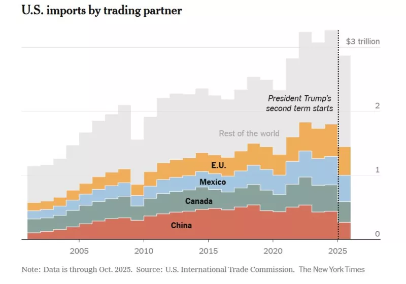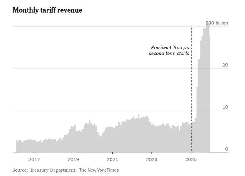 Μία από τις πιο απτές επιπτώσεις της εμπορικής πολιτικής του κ. Τραμπ ήταν η δραστική αύξηση των εσόδων που λαμβάνει η κυβέρνηση από τους δασμούς. Οι Ηνωμένες Πολιτείες εισέπραξαν περίπου 287 δισεκατομμύρια δολάρια σε δασμούς, φόρους και τέλη πέρυσι, σχεδόν τριπλασιασμός από το ποσό του 2024.