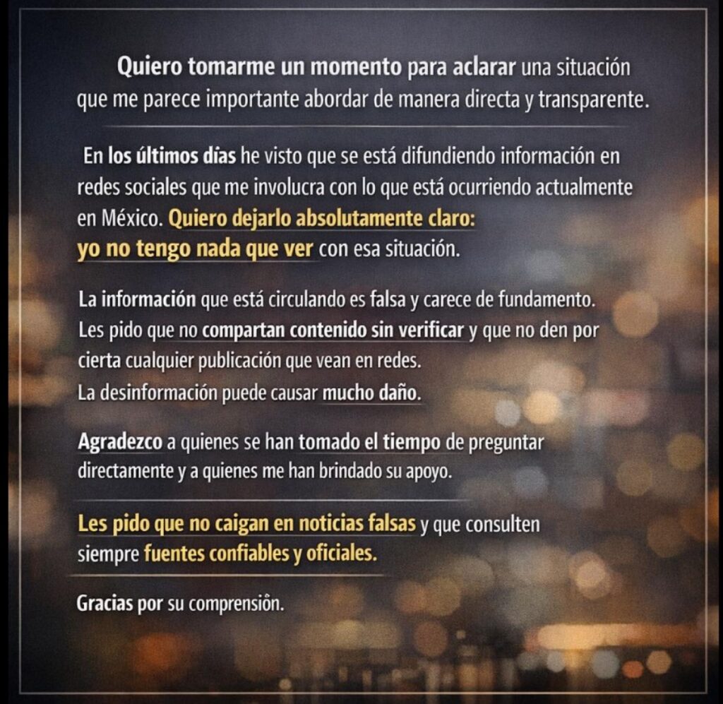 Η Μεξικανή influencer διαψεύδει κατηγορηματικά τους ισχυρισμούς αυτούς που τη συνδέουν με τον ηγέτη του καρτέλ Χαλίσκο Νέα Γενιά (CJNG), κάνοντας λόγο για επεξεργασμένες φωτογραφίες και βίντεο που φέρεται να έχουν δημιουργηθεί με τεχνητή νοημοσύνη.