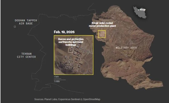 Το συγκρότημα Kοχίρ ανατολικά της Τεχεράνης, κοντά στην κορυφή Kuh-e Barjamali ύψους 2.108 μέτρων, είναι μια εκτεταμένη βιομηχανική εγκατάσταση, κρίσιμη για την προμήθεια καυσίμων και εξαρτημάτων βαλλιστικών πυραύλων. Οι εικόνες δείχνουν κτίρια χωρισμένα με αναχώματα και προστατευτικά τοιχία σχεδιασμένα να αποτρέπουν αλυσιδωτές εκρήξεις. Η εξάλειψη τέτοιας ικανότητας πιθανόν θα απαιτούσε επαναλαμβανόμενα πλήγματα.