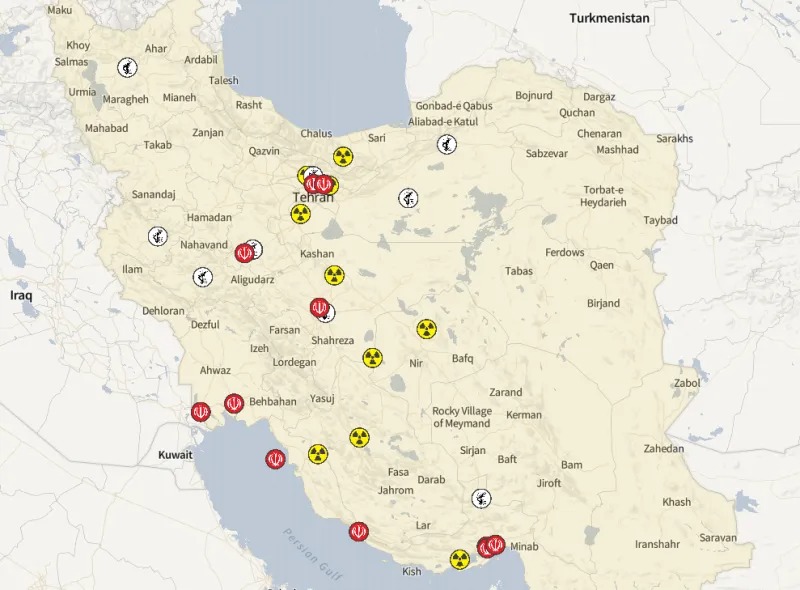 Συνολικά όλοι οι στόχοι σε έναν χάρτη: Επτά εγκαταστάσεις, πυρηνικές, στρατιωτικές και καθεστωτικές βρίσκονται έξω από την Τεχεράνη, ενώ οκτώ εγκαταστάσεις βρίσκονται κοντά στον Περσικό Κόλπο