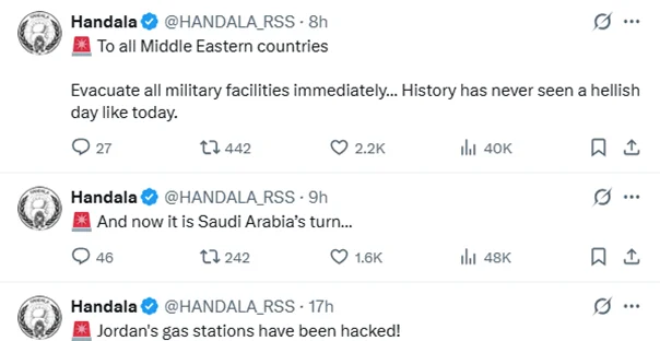 Ξεκινώντας από τον Ιανουάριο, εν μέσω πανεθνικών διαμαρτυριών και διακοπής λειτουργίας του διαδικτύου σε ολόκληρο το Ιράν, η Check Point Research παρατήρησε καμπάνιες Handala που προέρχονταν από περιοχές IP Starlink και εξέταζαν εξωτερικά εφαρμογές για λανθασμένες διαμορφώσεις και αδύναμα διαπιστευτήρια. Καθώς η σύγκρουση εξελίσσεται, ο απειλητικός παράγοντας άρχισε ήδη να προωθεί ισχυρισμούς και απειλητικά μηνύματα που στοχεύουν τις χώρες του Κόλπου και της Μέσης Ανατολής.