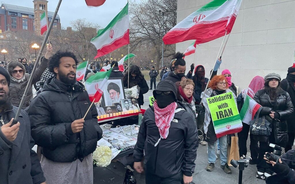 Διαδηλωτές στη Νέα Υόρκη φωνάζουν «θάνατος στην Αμερική, θάνατος στο Ισραήλ» στα Φαρσί, σε μια διαμαρτυρία προς τιμήν του εκλιπόντος Ανώτατου Ηγέτη του Ιράν Αλί Χαμενεΐ. Οι διαδηλωτές έστησαν εικόνες του Χαμενεΐ σε ένα τραπέζι δίπλα σε λουλούδια και κεριά, κρατούν σημαίες που δείχνουν το πρόσωπο του Τζέφρι Έπσταϊν και πλακάτ που γράφουν «αλληλεγγύη στο Ιράν».