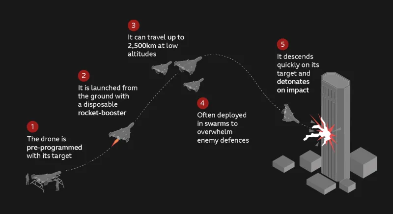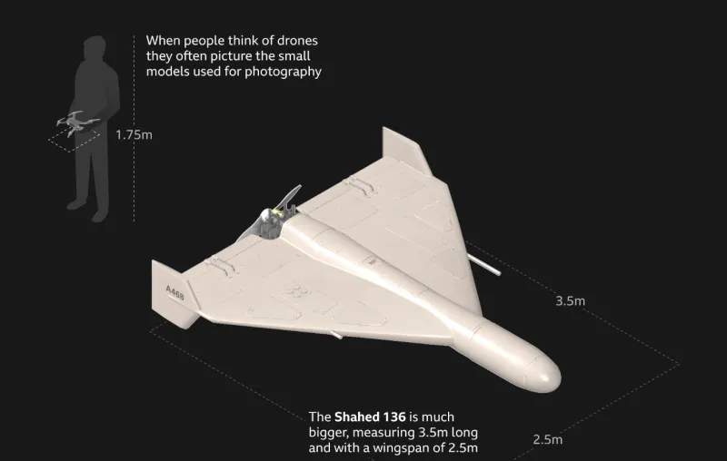 Αυτά τα «καμικάζι» Shahed drones μεταφέρουν εκρηκτικά που πυροδοτούνται κατά την πρόσκρουση και μπορούν να προκαλέσουν σημαντική ζημιά. Η πιο φονική επίθεση μέχρι στιγμής εναντίον αμερικανικών δυνάμεων σημειώθηκε όταν ένα drone έπληξε βάση στο Κουβέιτ, με αποτέλεσμα να σκοτωθούν έξι Αμερικανοί στρατιώτες.