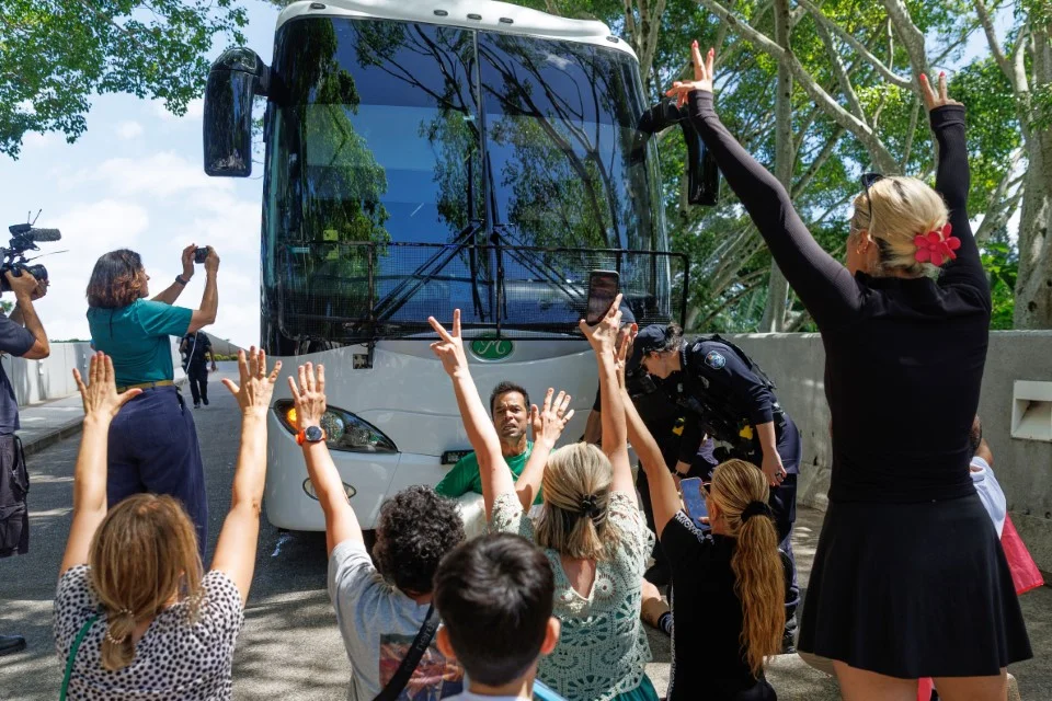 Τελικά, η Αστυνομία του Κουίνσλαντ επενέβη για να απομακρύνει τους διαδηλωτές και να ανοίξει δρόμο στο λεωφορείο. Ένας άνδρας που καθόταν μπροστά στο όχημα απομακρύνθηκε από αστυνομικούς, ενώ σύμφωνα με αξιωματούχο που μίλησε στη «Daily Mail», ένας διαδηλωτής φέρεται να επιτέθηκε στο λεωφορείο.