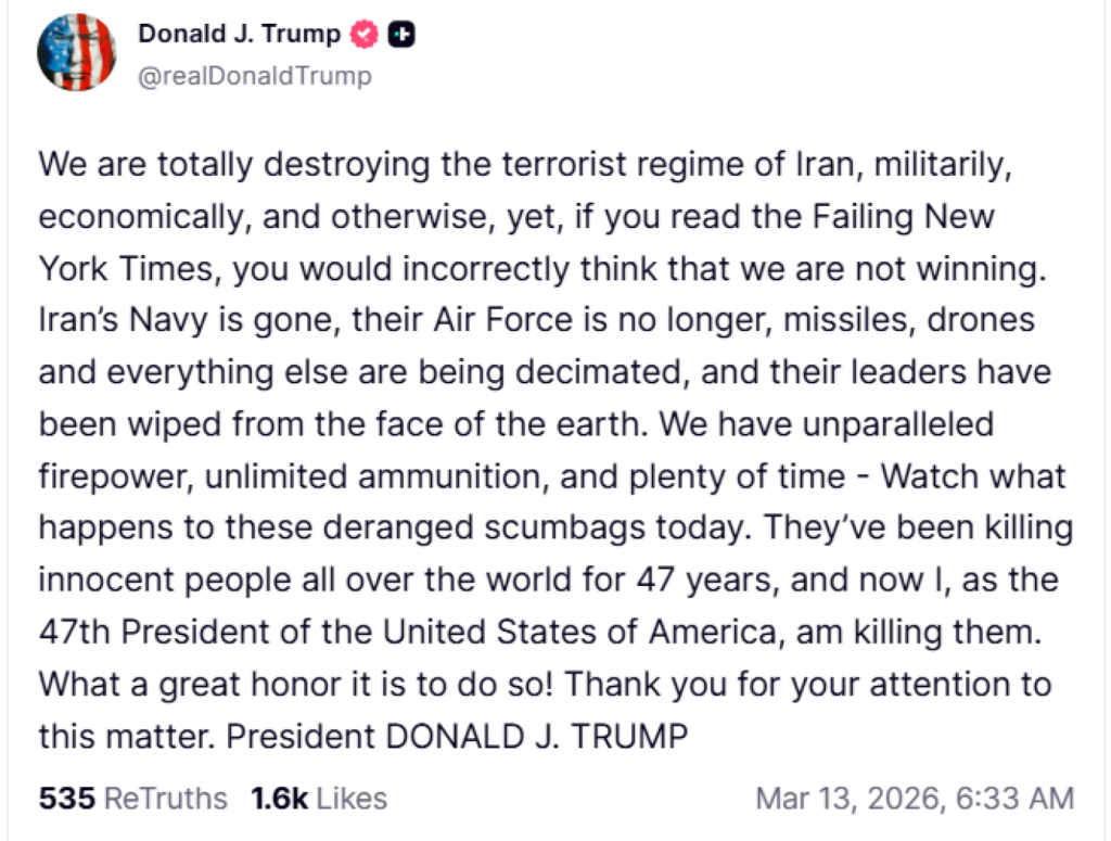«Παρακολουθήστε τι θα συμβεί σήμερα σε αυτούς τους τρελούς αλήτες. Σκοτώνουν αθώους ανθρώπους σε όλο τον κόσμο εδώ και 47 χρόνια, και τώρα εγώ, ως 47ος Πρόεδρος των Ηνωμένων Πολιτειών της Αμερικής, τους σκοτώνω. Τι μεγάλη τιμή είναι να το κάνω αυτό!» έγραψε χαρακτηριστικά ο Αμερικανός πρόεδρος.