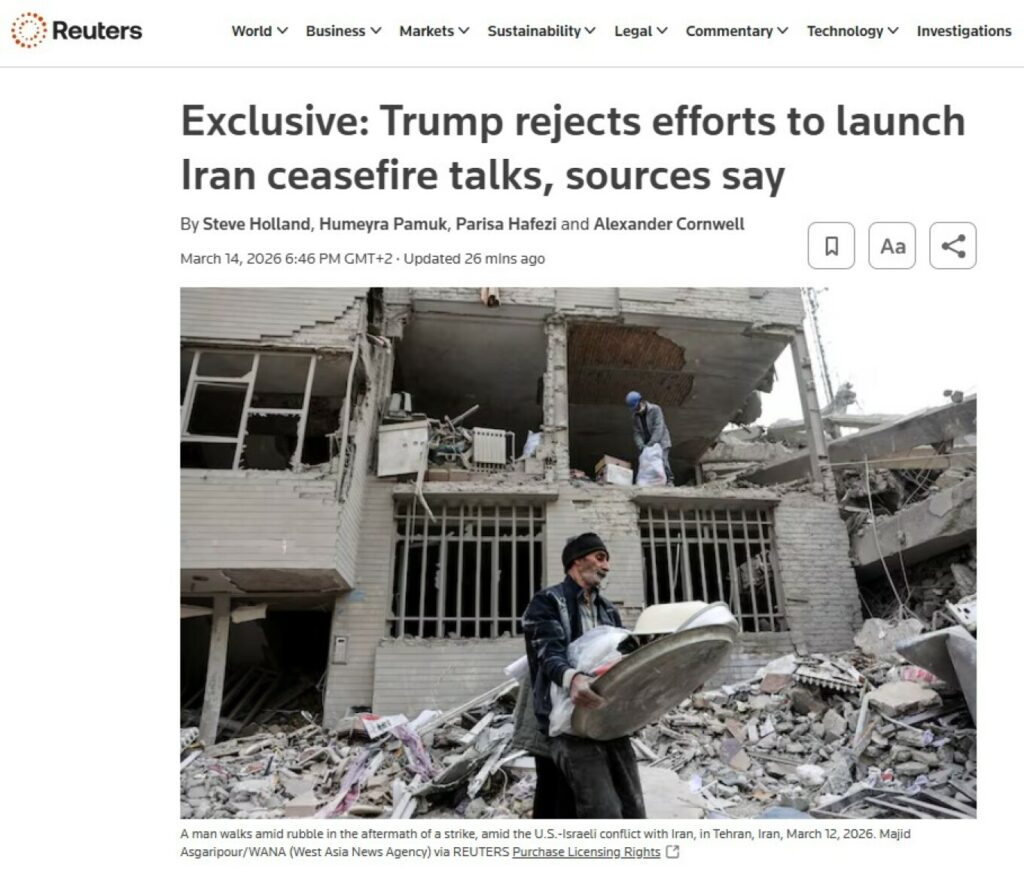 Το Ιράν έχει επίσης απορρίψει το ενδεχόμενο οποιασδήποτε εκεχειρίας μέχρι να σταματήσουν τα αμερικανικά και ισραηλινά πλήγματα, δήλωσαν στο Reuters δύο ανώτερες ιρανικές πηγές, προσθέτοντας ότι αρκετές χώρες προσπαθούν να μεσολαβήσουν για τον τερματισμό της σύγκρουσης.