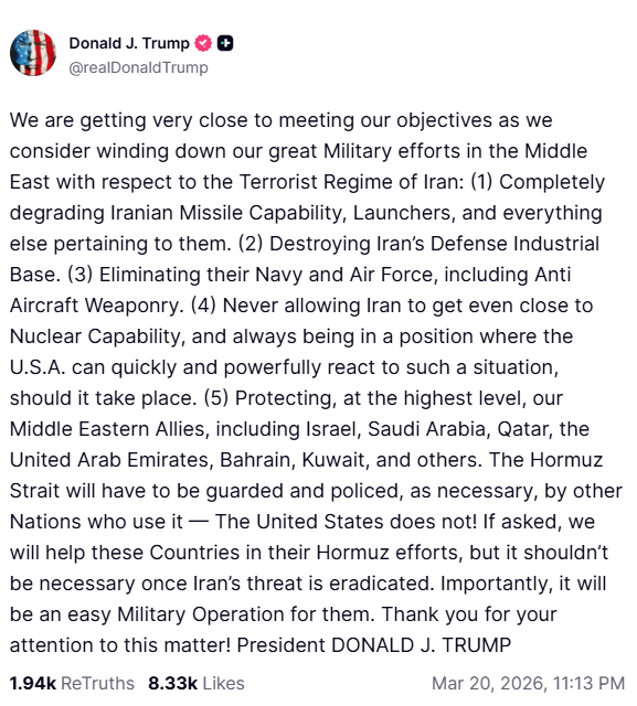 Ο Πρόεδρος Ντόναλντ Τραμπ ανακοίνωσε μέσω του Truth Social ότι οι Ηνωμένες Πολιτείες βρίσκονται πολύ κοντά στην επίτευξη των αντικειμενικών τους σκοπών όσον αφορά την αποδυνάμωση του τρομοκρατικού καθεστώτος του Ιράν, προαναγγέλλοντας τη σταδιακή ολοκλήρωση των μεγάλων στρατιωτικών επιχειρήσεων στη Μέση Ανατολή. Σύμφωνα με τον Αμερικανό Πρόεδρο, οι βασικοί πυλώνες αυτής της στρατηγικής περιλαμβάνουν την πλήρη εξάρθρωση των ιρανικών πυραυλικών δυνατοτήτων και των συστημάτων εκτόξευσης, την καταστροφή της αμυντικής βιομηχανικής βάσης της χώρας, καθώς και την εξουδετέρωση του ναυτικού και της αεροπορίας του Ιράν, συμπεριλαμβανομένων των αντιαεροπορικών όπλων.