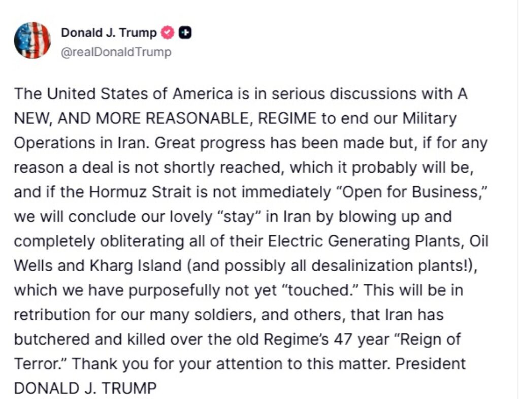 Η ανάρτηση του Αμερικανού προέδρου αναφέρει: «Οι Ηνωμένες Πολιτείες της Αμερικής βρίσκονται σε σοβαρές συζητήσεις με ένα ΝΕΟ ΚΑΙ ΠΙΟ ΛΟΓΙΚΟ ΚΑΘΕΣΤΩΣ για τον τερματισμό των στρατιωτικών μας επιχειρήσεων στο Ιράν. Έχει σημειωθεί μεγάλη πρόοδος, αλλά αν για οποιονδήποτε λόγο δεν επιτευχθεί σύντομα συμφωνία – πράγμα που πιθανότατα θα συμβεί – και αν το Στενό του Ορμούζ δεν «ανοίξει για δραστηριότητα» αμέσως, θα ολοκληρώσουμε την υπέροχη «παραμονή» μας στο Ιράν ανατινάζοντας και καταστρέφοντας ολοσχερώς όλα τα ηλεκτροπαραγωγικά εργοστάσιά τους, τις πετρελαιοπηγές και το νησί Χαργκ (και πιθανώς όλα τα εργοστάσια αφαλάτωσης!), τα οποία σκόπιμα δεν έχουμε «αγγίξει» ακόμα. Αυτό θα αποτελέσει αντίποινα για τους πολλούς στρατιώτες μας, και άλλους, που το Ιράν σφαγίασε και σκότωσε κατά τη διάρκεια της 47ετούς «Βασιλείας του Τρόμου» του παλαιού καθεστώτος. Σας ευχαριστώ για την προσοχή σας σε αυτό το θέμα».