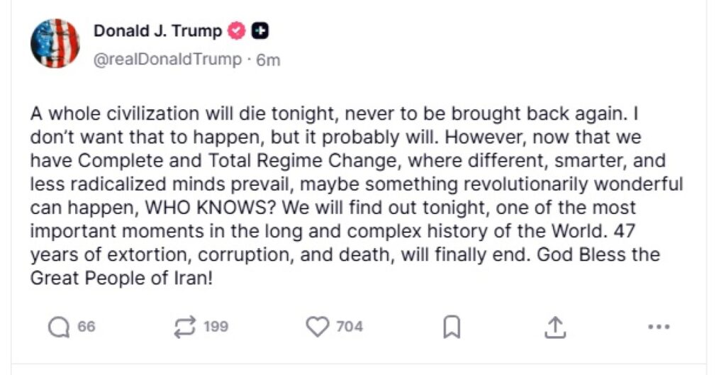 «Ένας ολόκληρος πολιτισμός θα πεθάνει απόψε, για να μην επιστρέψει ποτέ ξανά. Δεν θέλω να συμβεί αυτό, αλλά πιθανότατα θα συμβεί», τονίζει σε ανάρτησή του στο Truth Social, ο Ντόναλντ Τραμπ.