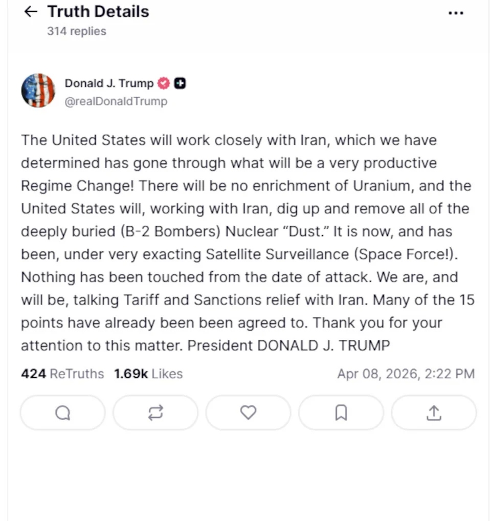 Σε ανάρτησή του στο Truth Social, ο Τραμπ δηλώνει ότι οι ΗΠΑ θα «συνεργαστούν στενά» με το Ιράν, αλλά «δεν θα γίνει εμπλουτισμός ουρανίου».