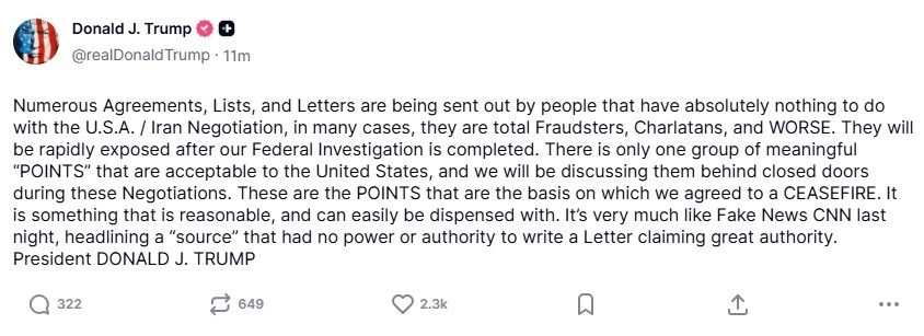 «Υπάρχει μόνο μία ομάδα ουσιαστικών «ΣΗΜΕΙΩΝ» που είναι αποδεκτά από τις Ηνωμένες Πολιτείες, και θα τα συζητήσουμε κεκλεισμένων των θυρών κατά τη διάρκεια αυτών των διαπραγματεύσεων. Αυτά είναι τα ΣΗΜΕΙΑ που αποτελούν τη βάση επί της οποίας συμφωνήσαμε για ΕΚΕΧΕΙΡΙΑ. Είναι κάτι λογικό και μπορεί εύκολα να παρακαμφθεί. Μοιάζει πολύ με τις ψευδείς ειδήσεις του CNN χθες το βράδυ, που έδωσαν πρωτοσέλιδο σε μια «πηγή» που δεν είχε καμία εξουσία ή αρμοδιότητα να γράψει μια επιστολή με την οποία διεκδικούσε μεγάλη εξουσία.»