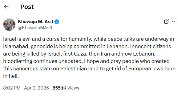Ο υπουργός Άμυνας του Πακιστάν, Καγουάτζα Ασίφ, χαρακτήρισε το Ισραήλ «κακό και κατάρα για την ανθρωπότητα» σε ανάρτησή του στo X, κατηγορώντας το ότι διαπράττει «γενοκτονία» στον Λίβανο ενώ βρίσκονται σε εξέλιξη ειρηνευτικές διαπραγματεύσεις.