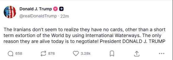 Παράλληλα, στην ανάρτησή του, ο Αμερικανός πρόεδρος σημείωσε ότι, κατά την εκτίμησή του, η ιρανική ηγεσία δεν βρίσκεται σε ισχυρή θέση, υποστηρίζοντας ότι η συνέχιση των διαπραγματεύσεων αποτελεί μονόδρομο για την Τεχεράνη: «Ο μόνος λόγος που επιβιώνουν σήμερα είναι για να διαπραγματευτούν» τόνισε χαρακτηριστικά.
