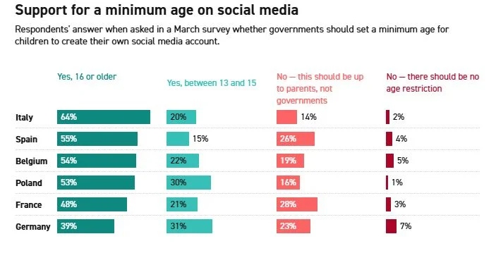 Συγκεκριμένα, τουλάχιστον 6 στους 10 συμφωνούν πως πρέπει να υπάρχει ηλικιακό όριο πρόσβασης, με τις μεγάλες χώρες να είναι ανάμεσα στην απαγόρευση κάτω των 16 ή κάτων των 13-15 ετών, με τους Γερμανούς να δείχνουν πιο ελαστικοί. Σε χώρες όπως η Ιταλία, το Βέλγιο ή η Πολωνία, το ποσοστό ξεπερνά το 75%.