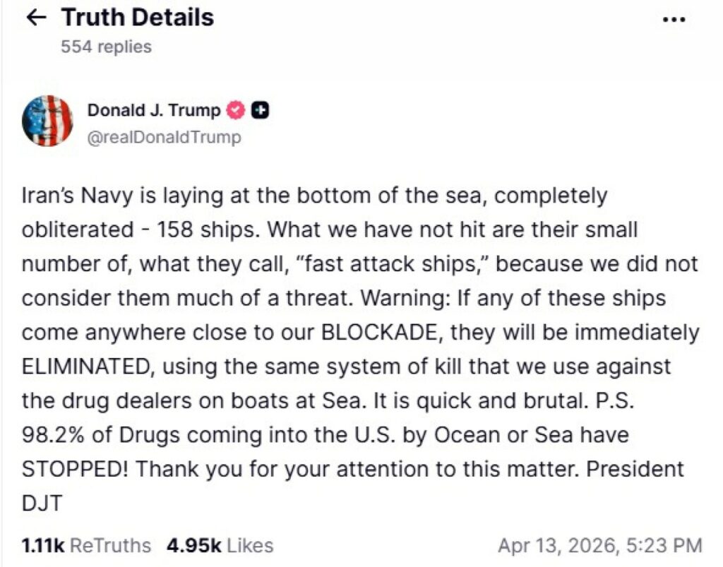 «Το Ναυτικό του Ιράν βρίσκεται στον πάτο της θάλασσας, εντελώς εξολοθρευμένο. 158 πλοία. Αυτό που δεν έχουμε χτυπήσει είναι ο μικρός αριθμός των αποκαλούμενων “πλοίων ταχείας επίθεσης”, επειδή δεν τα θεωρήσαμε ιδιαίτερη απειλή. Προειδοποίηση: Εάν οποιοδήποτε από αυτά τα πλοία πλησιάσει οπουδήποτε στον ΑΠΟΚΛΕΙΣΜΟ μας, θα ΧΤΥΠΗΘΕΙ αμέσως, με το ίδιο σύστημα εξόντωσης που χρησιμοποιούμε κατά των ναρκόπλοιων. Είναι γρήγορο και βάναυσο. Υ.Γ. Το 98,2% των ναρκωτικών που εισέρχονται στις ΗΠΑ μέσω ωκεανού ή θάλασσας έχει ΣΤΑΜΑΤΗΣΕΙ! Σας ευχαριστώ για την προσοχή σας επί του θέματος».