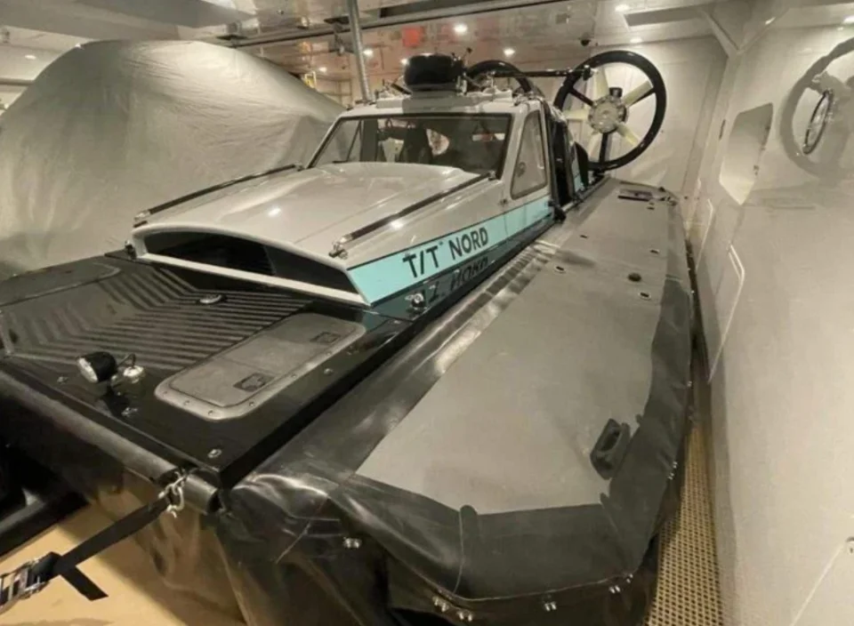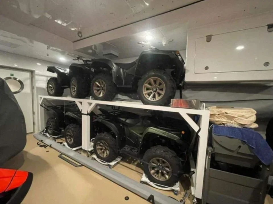 Ιδιαίτερο ενδιαφέρον παρουσιάζει ο εξοπλισμός του σκάφους. Το γκαράζ του περιλαμβάνει μεγάλο αριθμό βοηθητικών σκαφών και οχημάτων, όπως ταχύπλοα, jet ski και τετράτροχες μηχανές (τις επονομαζόμενες γουρούνες) ενώ υπάρχει και hovercraft ικανό να κινείται σε στεριά και νερό. Επιπλέον, το σκάφος διαθέτει ένα μικρό υποβρύχιο τύπου Triton, ενώ έχει και γκαράζ για αυτοκίνητα τύπου SUV τα οποία πιθανόν χρησιμοποιούνται από τα μέλη της ασφάλειας του Ρώσου Ολιγάρχη.