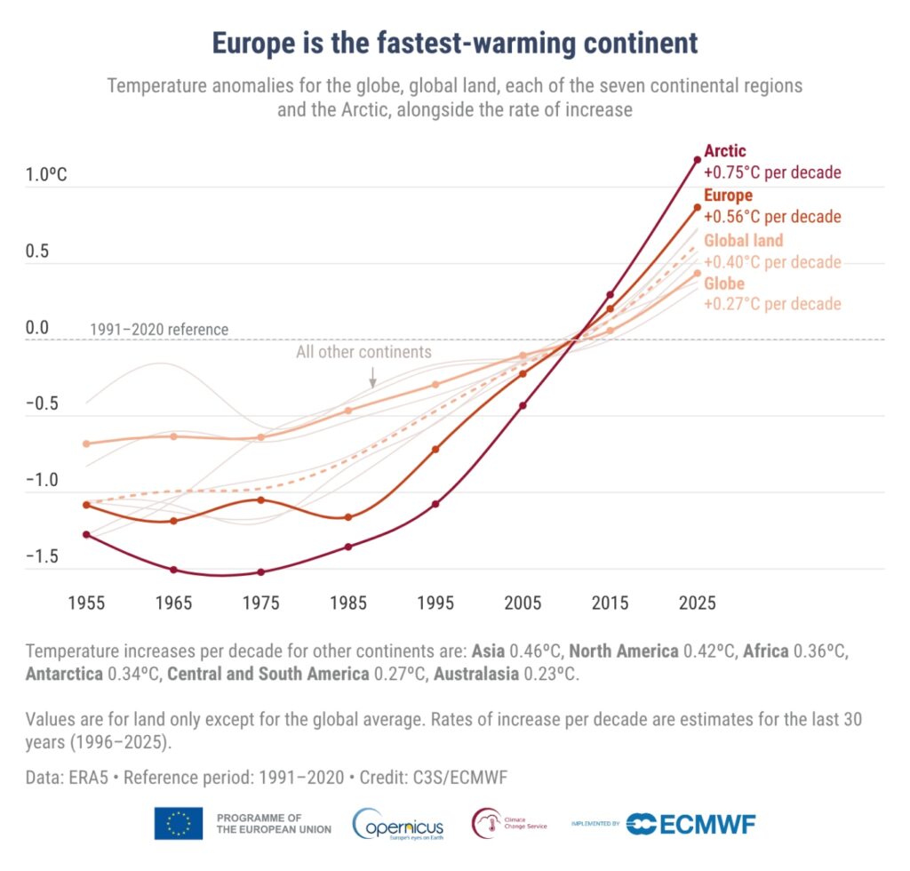 Η Ευρώπη σε συντριπτικό ποσοστό, τουλάχιστον 95%, βίωσε το 2025 ετήσιες θερμοκρασίες άνω του μέσου όρου, με τα κύματα καύσωνα να επηρεάζουν μεγάλα τμήματα της ηπείρου, από τη Μεσόγειο ως την Αρκτική. Η ραγδαία αύξηση της θερμοκρασίας είχε ως αποτέλεσμα τη μείωση κάλυψης χιονιού και πάγου, που παίζουν κρίσιμο ρόλο στην επιβράδυνση της κλιματικής αλλαγής.