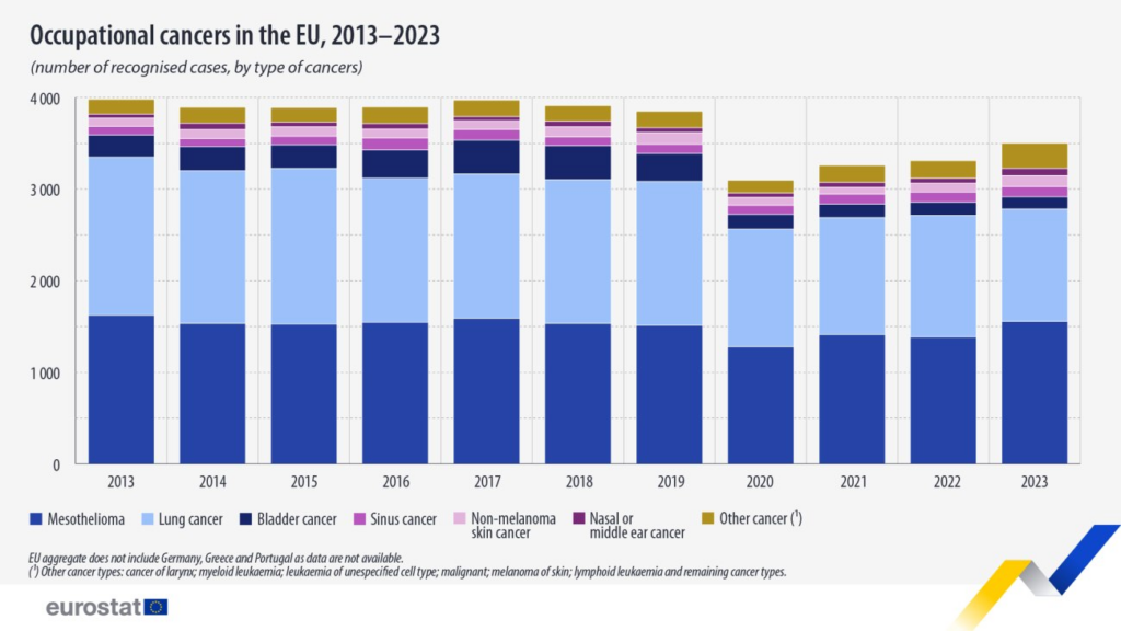 Σύμφωνα με την Eurostat, το 2023, αναγνωρίστηκαν 3.500 περιπτώσεις καρκίνου που σχετίζονται με την εργασία, 191 περισσότερες από ό,τι το 2022 (3.309).