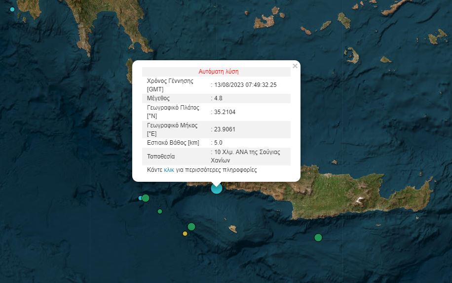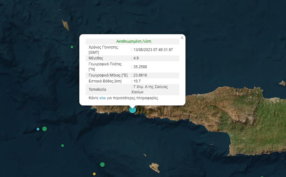 Σεισμική δόνηση 4,9 βαθμών -σύμφωνα με την αυτόματη λύση του Γεωδυναμικού Ινστιτούτου- ταρακούνησε τη δυτική Κρήτη το πρωί της Κυριακής.