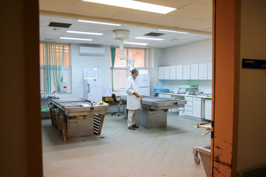 Ο ιατροδικαστής Παύλος Παυλίδης, ο οποίος έκανε νεκροψία σε πτώματα δεκαοκτώ ατόμων, που βρέθηκαν μετά από πυρκαγιά και πιστεύεται ότι είναι μετανάστες, στέκεται μέσα στο νεκροτομείο του Πανεπιστημιακού Νοσοκομείου Αλεξανδρούπολης, στην περιοχή του Έβρου, Ελλάδα, 24 Αυγούστου 2023. REUTERS /Αλέξανδρος Αβραμίδης