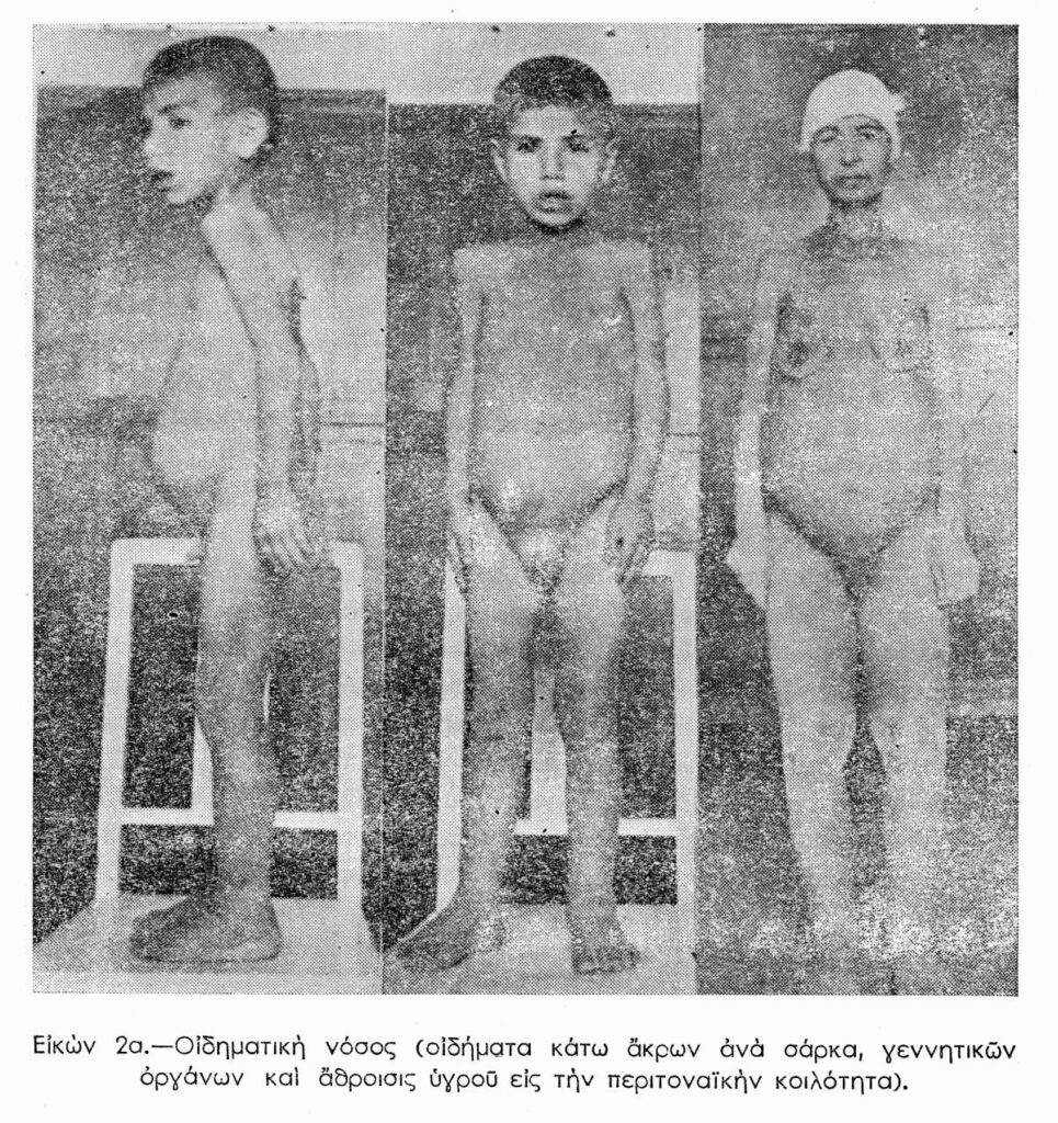 Μικρά παιδιά με γενικευμένο οίδημα που προκλήθηκε από τον υποσιτισμό, το οποίο ξεκινά από την περιοχή των αστραγάλων και ανεβαίνει κεντρικά στο σώμα του ασθενούς.