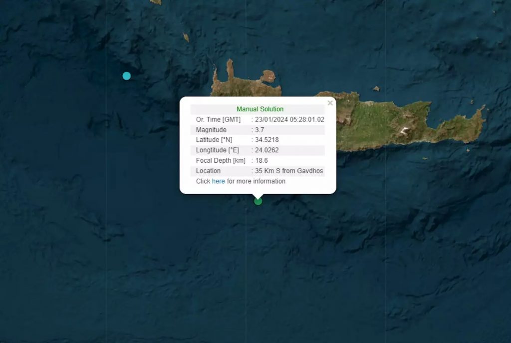 Σεισμός μεγέθους 3,7 βαθμών της κλίμακας Ρίχτερ σημειώθηκε το πρωί της Τρίτης, 23 Ιανουαρίου, στις 07:28, στην Γαύδο.