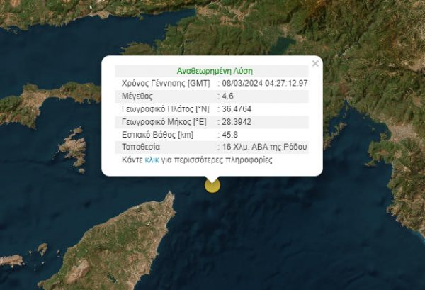 Σεισμός μεγέθους 4,6 βαθμών της κλίμακας Ρίχτερ σημειώθηκε ανοιχτά της Ρόδου.