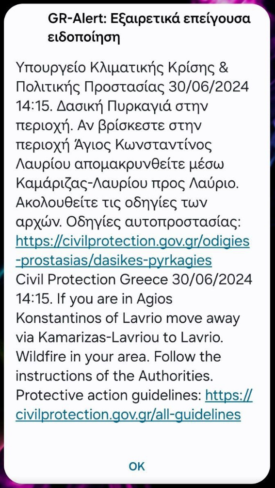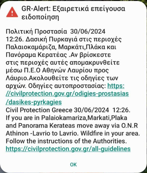 Θυμίζουμε ότι στις 12:35, λόγω της πυρκαγιάς, στάλθηκε μήνυμα όπου αναφέρει ότι όσοι βρίσκονται στους οικισμούς Παλαιοκαμάριζα, Μαρκάτι, Πλάκα και Πανόραμα στην Κερατέα πρέπει να απομακρυνθούν μέσω της παλιάς εθνικής οδού Αθηνών-Λαυρίου προς το Λαύριο.