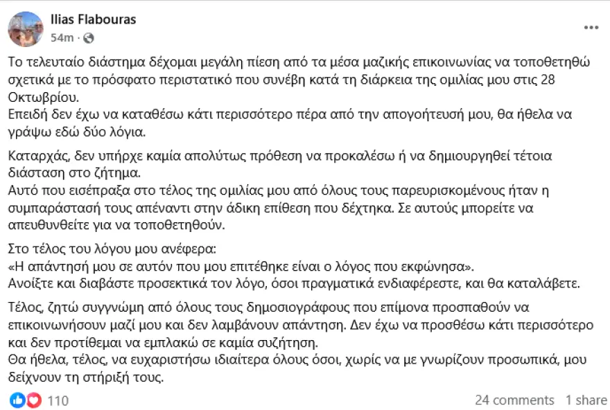 «Το τελευταίο διάστημα δέχομαι μεγάλη πίεση από τα μέσα μαζικής επικοινωνίας να τοποθετηθώ σχετικά με το πρόσφατο περιστατικό που συνέβη κατά τη διάρκεια της ομιλίας μου στις 28 Οκτωβρίου.