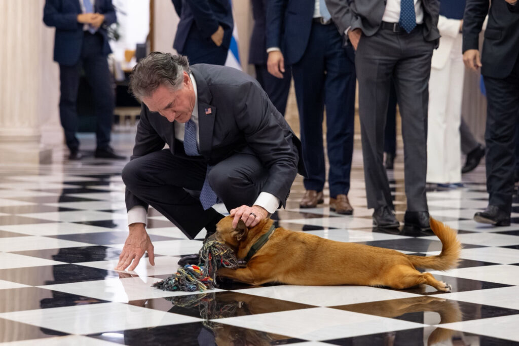 Εκεί ο υπουργός Εσωτερικών των ΗΠΑ, Νταγκ Μπέργκμαν, είδε τον σκύλο του Μεγάρου Μαξίμου, Πίνατ, στο πάτωμα να δαγκώνει ένα παιχνίδι και στη συνέχεια έσκυψε να τον χαϊδέψει.