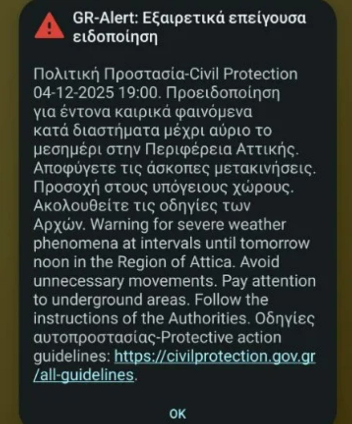 Στο μήνυμα η Πολιτική Προστασία προειδοποιεί για έντονα φαινόμενα ως το μεσημέρι της Παρασκευής και προτρέπει τους πολίτες να αποφύγουν τις άσκοπες μετακινήσεις και να είναι ιδιαίτερα προσεκτικοί στους υπόγειους χώρους.