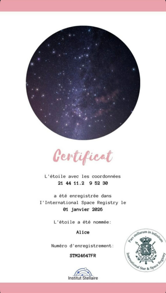 Στον προσωπικό του λογαριασμό στο Instagram δημοσίευσε πιστοποιητικό ονοματοδοσίας αστεριού, το οποίο, σύμφωνα με τα στοιχεία που αναγράφονται, καταχωρήθηκε την 1η Ιανουαρίου 2026 με συγκεκριμένες αστρονομικές συντεταγμένες και φέρει πλέον το όνομα «Αλίκη».