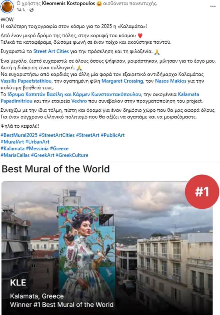«Από έναν μικρό δρόμο της πόλης, στην κορυφή του κόσμου. Τελικά τα καταφέραμε, δώσαμε φωνή σε έναν τοίχο και ακούστηκε παντού. Ευχαριστώ το Street Art Cities για την πρόσκληση και τη φιλοξενία. Ένα μεγάλο, ζεστό ευχαριστώ σε όλους όσους ψήφισαν, μοιράστηκαν, μίλησαν για το έργο μου. Αυτή η διάκριση είναι συλλογική», αναφέρει ο εικαστικός Κλεομένης Κωστόπουλος από την Πάτρα που βρίσκεται πίσω από την τοιχογραφία.