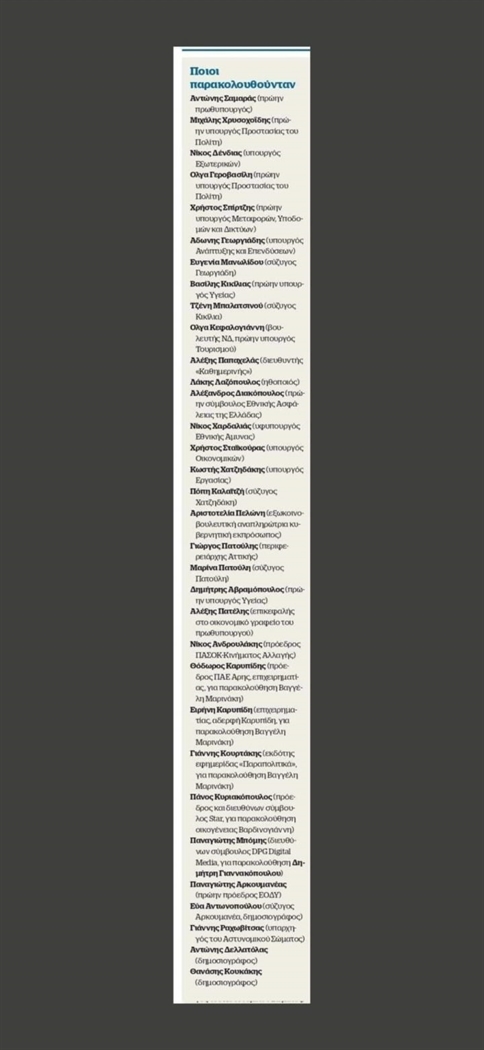 Λίστα με ονόματα –στην πλειοψηφία τους πολιτικά, χωρίς να λείπουν εκπλήξεις από τον επιχειρηματικό και δημοσιογραφικό χώρο- που αποτέλεσαν στόχους παρακολούθησης για την κυβέρνηση δημοσιεύει...