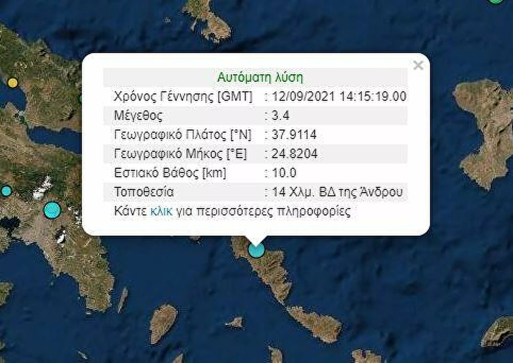 Σεισμός σημειώθηκε το απόγευμα της Κυριακής (12/09) στη θαλάσσια περιοχή της Άνδρου.