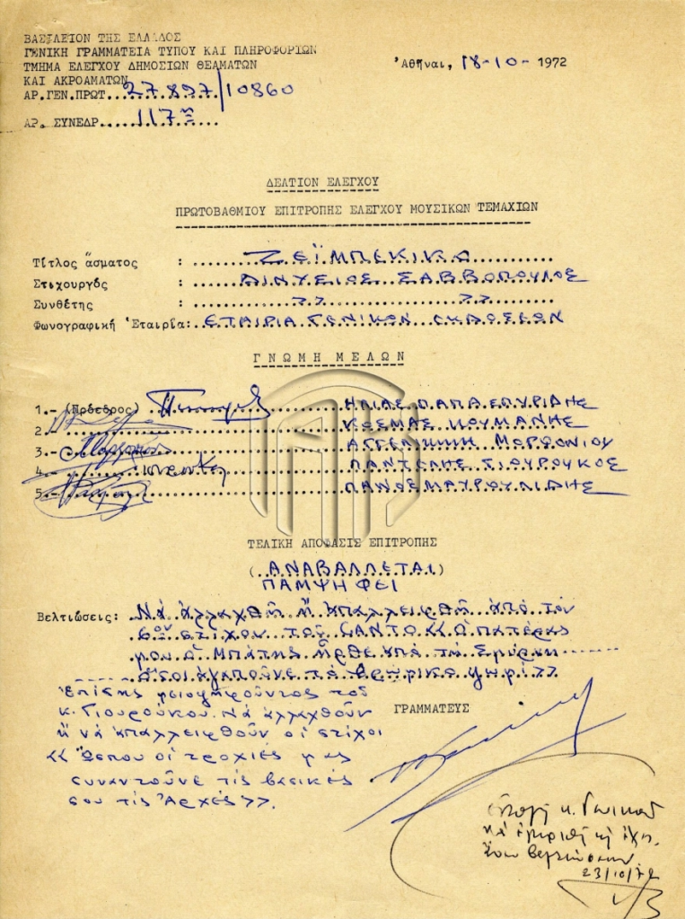 Πάντως, πιο κάτω διευκρινίζεται: «Εντολή κ. Γενικού. Να εγκριθεί ως έχει άνευ βελτιώσεων. 23/10/72», με αποτέλεσμα το τραγούδι να κυκλοφορήσει κανονικά.