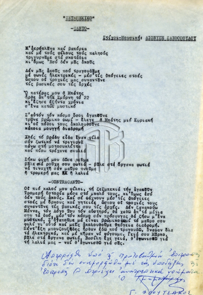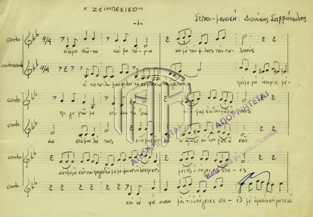 Ο Διονύσης Σαββόπουλος εμφανίστηκε στη μουσική σκηνή της χώρας τη δεκαετία του 1960 και, κυρίως, την περίοδο της δικτατορίας των συνταγματαρχών. Ο Σαββόπουλος, συνδυάζοντας με έναν δικό του τρόπο την ελληνική παραδοσιακή μουσική με το δυτικό ροκ, μίλησε για ζητήματα που απασχολούσαν την αναδυόμενη στον δημόσιο και πολιτικό βίο νεολαία. Την περίοδο της χούντας τα τραγούδια του Σαββόπουλου εκφράζουν τη νεανική κουλτούρα και την κουλτούρα της ελεύθερης έκφρασης και της αντίστασης απέναντι στη ζοφερή πραγματικότητα της δικτατορίας. Ο Σαββόπουλος, όπως και οι υπόλοιποι καλλιτέχνες, έπρεπε να προσπελάσουν το ψαλίδι της λογοκρισίας. Τα τεκμήρια της ανάρτησης αφορούν τη λογοκρισία του εμβληματικού τραγουδιού του Σαββόπουλου «Ζεϊμπέκικο» από την επιτροπή λογοκρισίας της Γενικής Γραμματείας Τύπου και Πληροφοριών το αρχείο της οποίας βρίσκεται στην Κεντρική Υπηρεσία των ΓΑΚ.