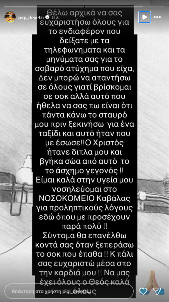 «Θέλω αρχικά να σας ευχαριστήσω όλους για το ενδιαφέρον που δείξατε με τα τηλεφωνήματα και τα μηνύματά σας για το σοβαρό ατύχημα που είχα. Δεν μπορώ να απαντήσω σε όλους γιατί βρίσκομαι σε σοκ, αλλά αυτό που ήθελα να σας πως είναι ότι πάντα κάνω τον σταυρό μου πριν ξεκινήσω ένα ταξίδι και αυτό ήταν που με έσωσε. Ο Χριστός ήταν δίπλα μου και βγήκα σώα από αυτό το άσχημο γεγονός. Είμαι καλά στην υγεία μου, νοσηλεύομαι στο νοσοκομείο Καβάλας για προληπτικούς λόγους εδώ όπου με προσέχουν πάρα πολύ».