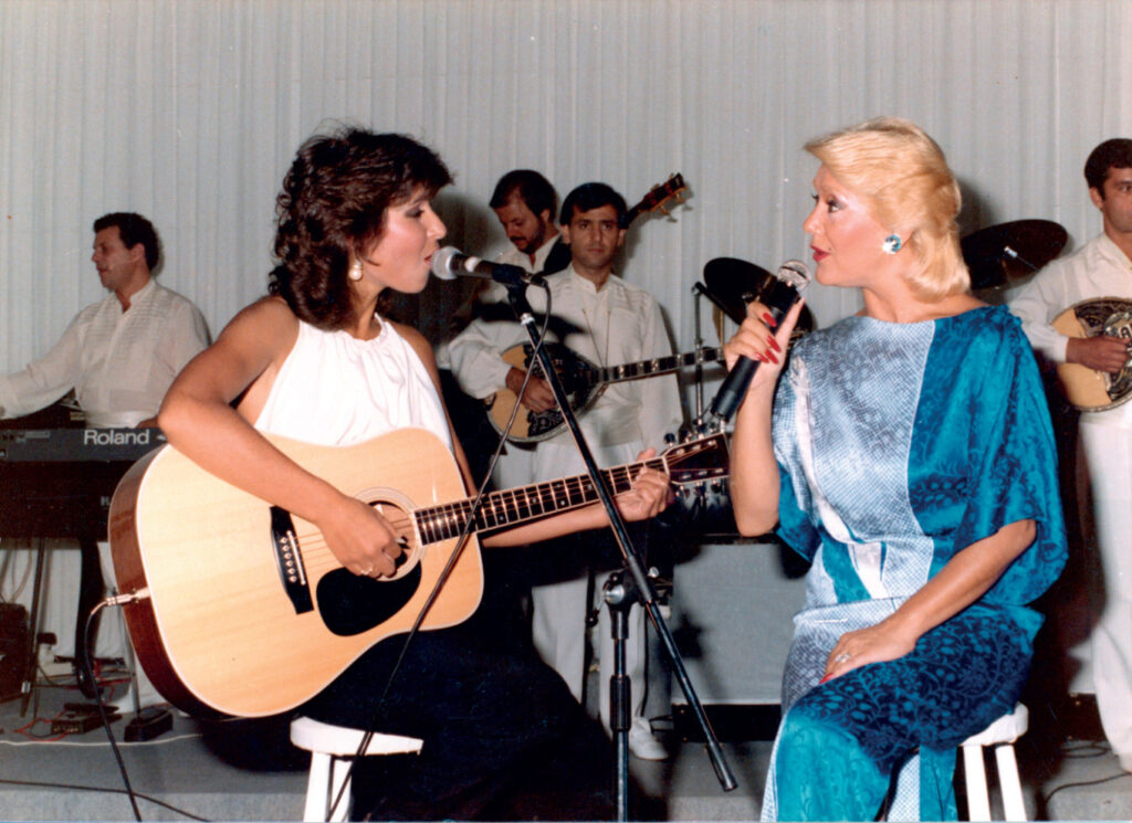 Η Μαρινέλλα, η Βίσση & η κόντρα: Μετά τη Eurovision του ’83 συνεργάστηκα με τη Μαρινέλλα σε ένα φανταστικό σχήμα που ξεκίνησε στη Θεσσαλονίκη. Ημασταν πέντε γυναίκες. Εκείνη, η Βίκυ Μοσχολιού, η Αννα Βίσση, η Δώρα Στέρη κι εγώ. Στη σκηνή γίνονταν χαμός. Θυμάμαι πως όλες μαζί κάναμε τις αδελφές Τατά. Η Μαρινέλλα ήταν πρωτοπόρος. Μου έλεγε: «Εχεις τα φόντα να κάνεις καριέρα. Θέλω να βγαίνεις και να βλέπεις πώς είμαι στη σκηνή». Με στήριξε πολύ. Κάναμε και ντουέτο το τραγούδι της «Μπορεί». Με τη Βίσση υπήρξε μία προστριβή – βέβαια αυτά πια έχουν περάσει. Τότε έβγαζε το «Δώδεκα». Ενώ η Μαρινέλλα με αβαντζάριζε και αποφάσισε να φωτογραφηθούμε οι πέντε μαζί, από το team της Βίσση υπήρξε αντίδραση και η φωτογράφηση έγινε ξανά με τα τρία μεγάλα ονόματα.