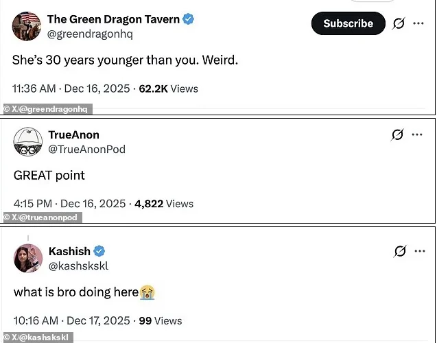 Αρκετοί χρήστες του X, όπως αναφέρει η DailyMail, αντέδρασαν έντονα με την ανάρτηση του Έλον Μασκ, επειδή είναι πολύ μεγαλύτερος από αυτήν. «Είναι 30 χρόνια νεότερή σου. Παράξενο», έγραψε ένας χρήστης υπογραμμίζοντας τη διαφορά 26 χρόνων.